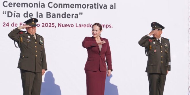 Nuevo Laredo, Tamps. – Con un profundo sentido de patriotismo y orgullo, la presidenta municipal Carmen Lilia Canturosas Villarreal encabezó la celebración del Día de la Bandera en una solemne ceremonia cívica realizada en el Décimo Sexto Regimiento de Caballería Motorizado de Nuevo Laredo. El evento, que contó con la participación de cientos de estudiantes y autoridades militares, resaltó la importancia de los valores cívicos y el respeto a los símbolos patrios.