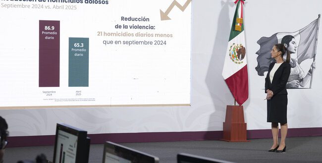 En su conferencia matutina, la Presidenta destacó la disminución de 21 homicidios diarios como resultado de la coordinación nacional, el fortalecimiento de la Guardia Nacional y una apuesta clara por la inteligencia e investigación. “Es un logro extraordinario del trabajo diario de nuestras fuerzas armadas, policías y fiscalías”, expresó.