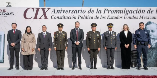 El alcalde de Piedras Negras, Jacobo Rodríguez, encabezó la ceremonia cívica con motivo del CIX Aniversario de la Promulgación de la Constitución Política de los Estados Unidos Mexicanos, acto realizado con la participación de autoridades civiles, militares, educativas y estudiantes de la localidad, con el propósito de fortalecer los valores cívicos y el respeto al marco legal que rige al país.