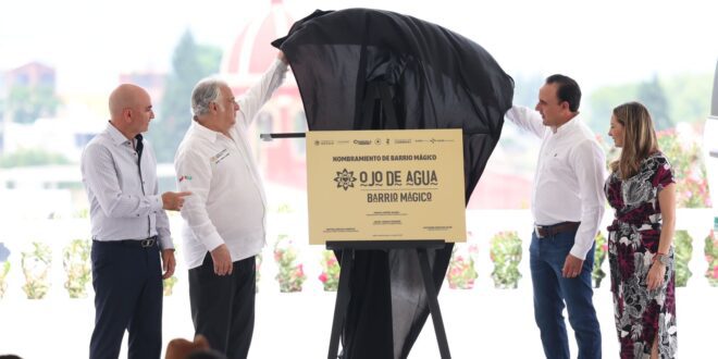 Saltillo, Coahuila de Zaragoza.- “Yo siempre he dicho que el trabajo coordinado y en equipo entre el Estado, los Municipios y la Federación, siempre da mejores resultados”, mencionó el gobernador Manolo Jiménez Salinas quien acompañado por Miguel Torruco Marqués, secretario de Turismo federal, develaron la placa de denominación de “Barrio Mágico” al Ojo de Agua en Saltillo, el primero en Coahuila, ceremonia con la que se siguen reconociendo excelentes sitios turísticos de nuestra entidad.