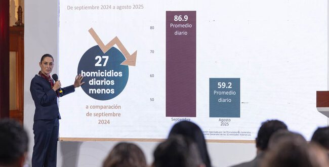 Ciudad de México.– La Estrategia Nacional de Seguridad implementada por el Gobierno de México muestra resultados históricos: en agosto de 2025, el promedio diario de homicidios dolosos bajó de 86.9 víctimas en septiembre de 2024 a 59.2, lo que representa una reducción del 32%, equivalente a 27 vidas salvadas cada día.