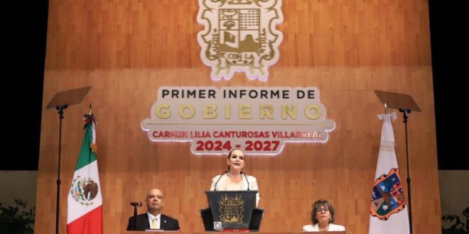 Nuevo Laredo, Tamaulipas.– Con un teatro abarrotado en el Centro Cultural y frente a autoridades de los tres órdenes de gobierno, la alcaldesa Carmen Lilia Canturosas Villarreal presentó su Primer Informe de Resultados del segundo periodo 2024-2027, destacando que la ciudad vive un momento histórico de transformación, desarrollo y bienestar compartido.