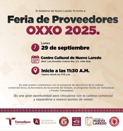 Nuevo Laredo.– El próximo lunes 29 de septiembre, el Gobierno Municipal de Nuevo Laredo convoca a productores, empresarios y emprendedores a participar en la Feria de Proveedores OXXO 2025, un evento que promete convertirse en un punto de encuentro clave para quienes buscan expandir sus negocios y posicionar sus productos en una de las cadenas comerciales más importantes de México.