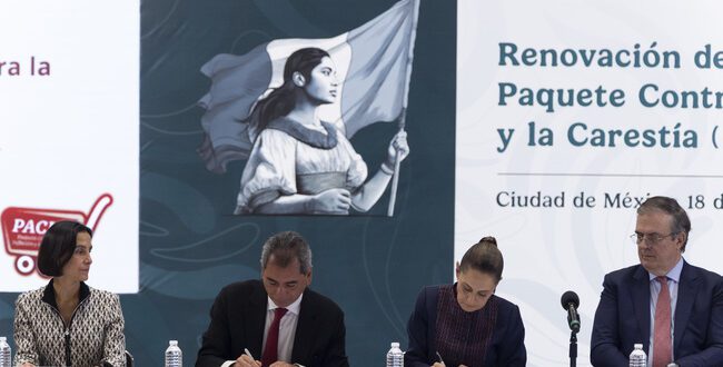 Ciudad de México.– La Presidenta de México, Claudia Sheinbaum Pardo, encabezó este lunes la firma de la renovación del Paquete Contra la Inflación y la Carestía (Pacic), acuerdo mediante el cual se mantendrá en 910 pesos el precio de los 24 productos que integran la canasta básica durante los próximos seis meses, en coordinación con 20 empresas productoras y 12 cadenas de autoservicio del país.
