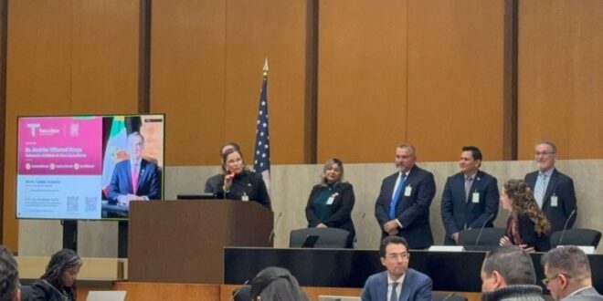 En representación del gobernador Américo Villarreal Anaya, la funcionaria subrayó que Nuevo Laredo se consolida como la plataforma aduanera más importante de América, al concentrar más del 40% del comercio terrestre entre ambos países.